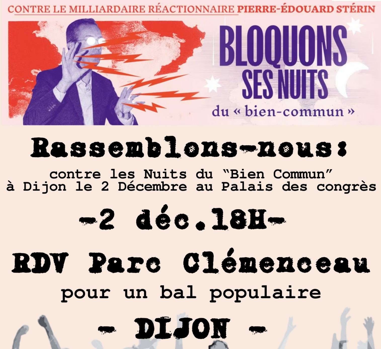Rassemblons-nous contre la Nuit (dite) du bien commun Contre Stérin et son monde Parc Clémenceau -DIJON- dès 18h La FSU21, au sein d'un collectif d'organisations mobilisées contre Stérin et son monde, et notamment contre la Nuit (dite) du bien commun qui se tiendra au même moment au Palais des congrès, appelle à un contre-événement. Retrouvons-nous parc Clémenceau, rue Malraux (à côté du conservatoire), dès 18h. Au programme : prises [...]