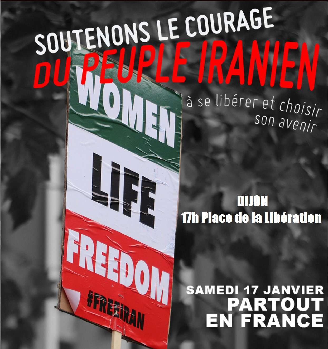 Appel à rassemblement Dijon samedi 17 janvier à 17h place de la Libération Soutenons le courage du peuple iranien à se libérer et à choisir son avenir ! Le 28 décembre, les Iraniennes et les Iraniens sont descendus dans la rue, d’abord pour dénoncer le coût de la vie et rapidement pour se libérer du joug de la dictature criminelle, théocratique, militarisée et patriarcale de Khamenei. À Téhéran, à Chiraz, [...]